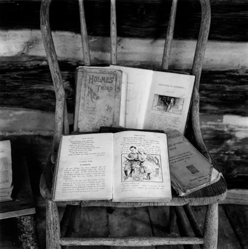 Illustrated Schoolbooks on Chair, York Log Schoolhouse. From Schoolhouse Odyssey 2004 © Diana Schoenfeld